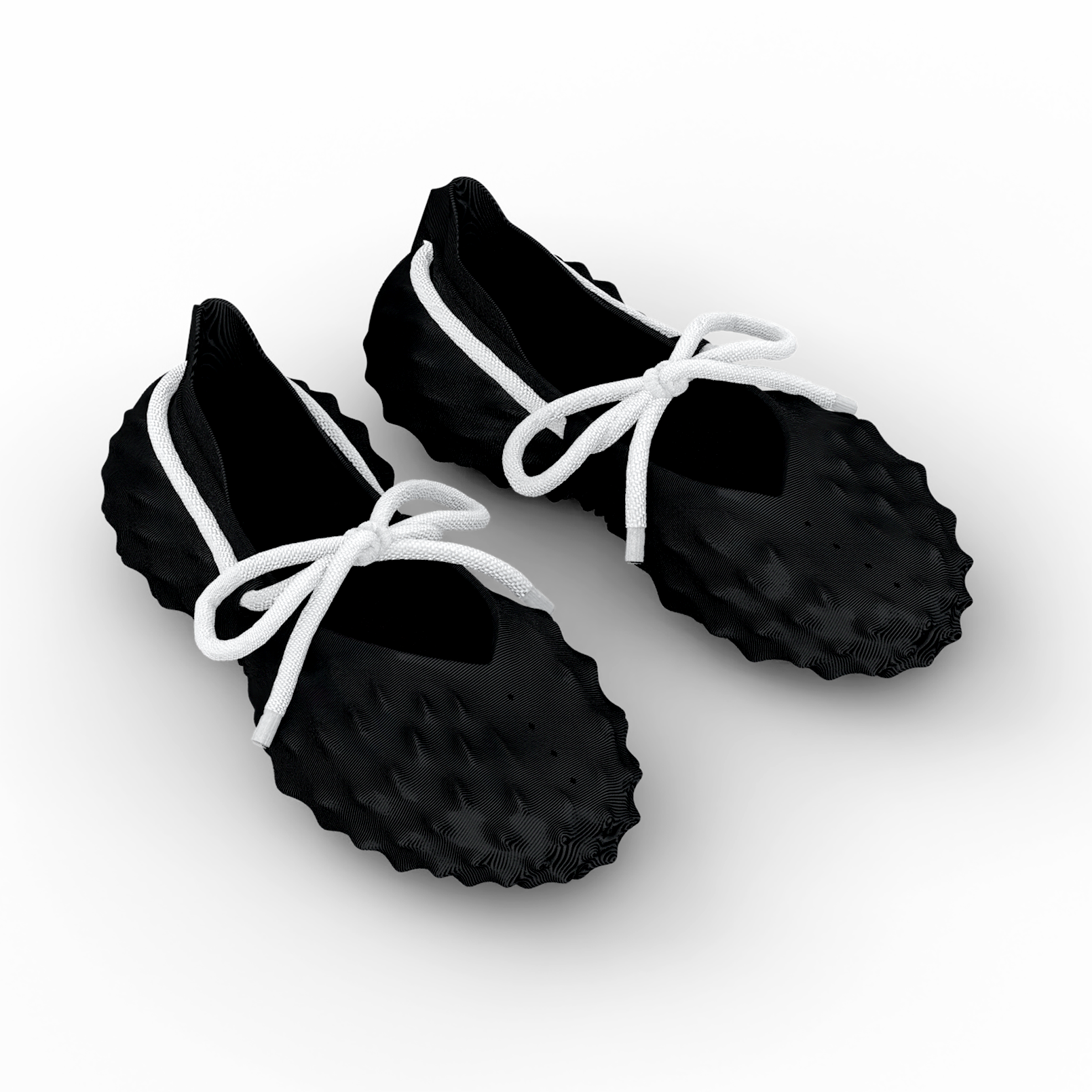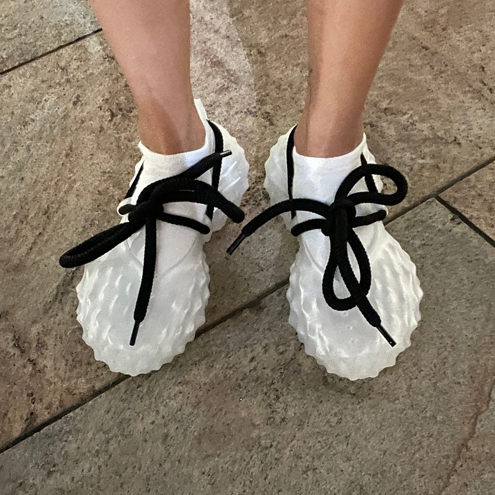The FUSED Dura is 3D printed in one piece and made to order. They can be ordered in All White, All Black, Translucent or as a Mixed pair with each shoe a different color.